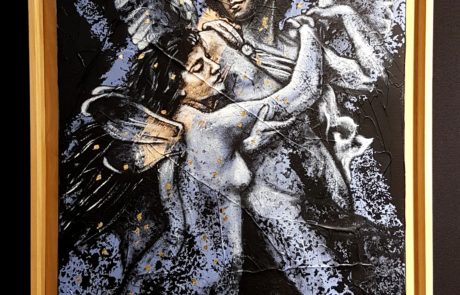 - Travail complet réalisé par l’artiste : choix de la toile, mise en tension sur un châssis, peinture acrylique, pose de feuilles d’or à la main, bordage soigné des contours du châssis, encadrement bois clair